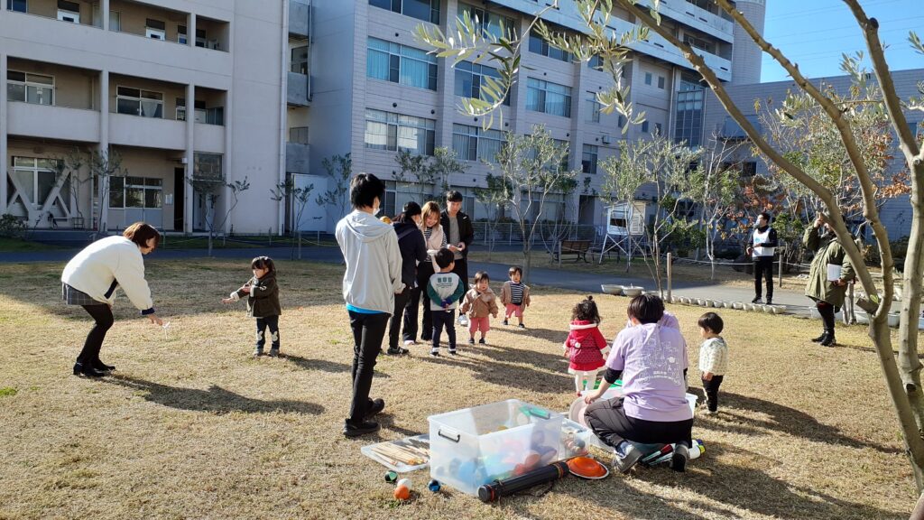 大学生と外で遊ぶコーナー。元気な声が響いていました。