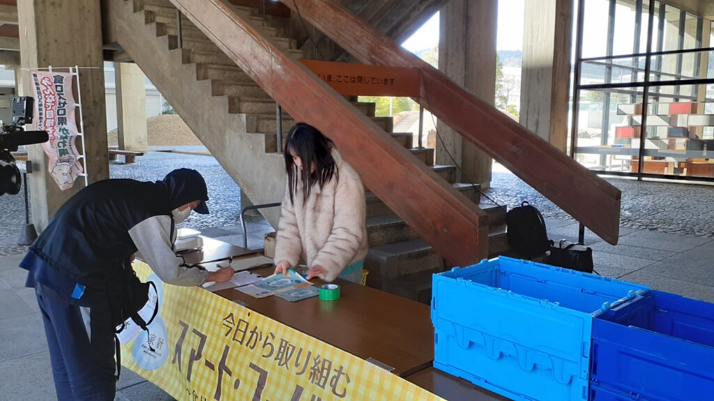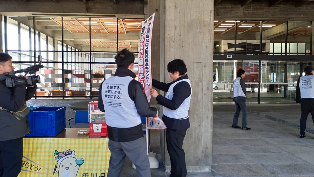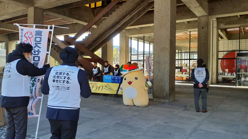 1月22日、プロジェクトメンバーはSteeePの皆さんと一緒に香川県庁に受付ブースを設置し、県庁を訪れる方にチラシを配ってフードドライブへの協力を呼びかけたり、食品寄付の受付をお手伝いしたりしました。