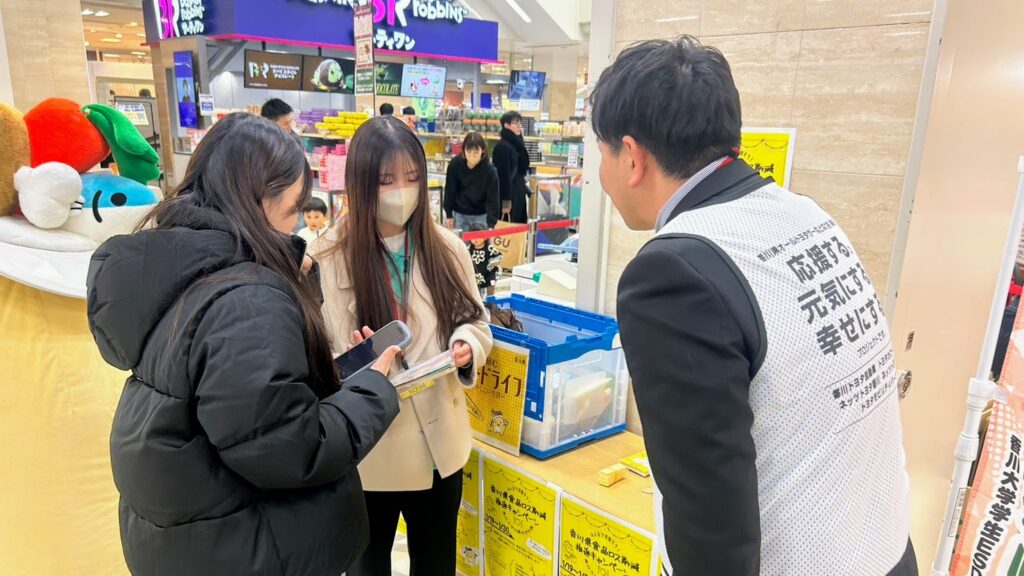 フードドライブウィークを間近に控えたこの日は、県内のスーパーマーケットで実施するフードドライブの準備をお手伝い。プロジェクトメンバーは、香川県学生ESDプロジェクトSteeePのメンバーと一緒にスーパーマーケットの各店舗をまわり、店舗に設置する資材の搬入などをサポートします。
