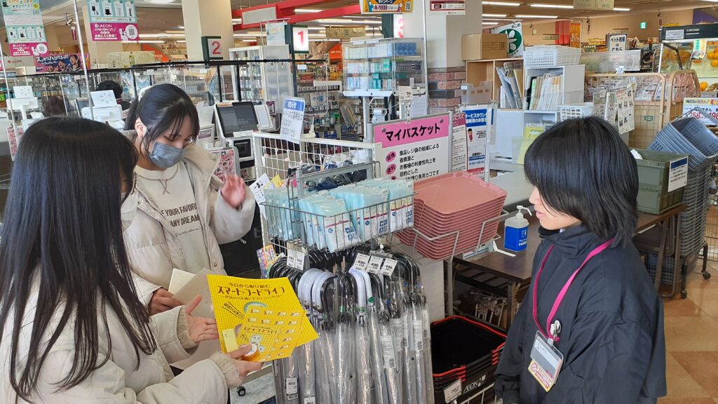 この日もグループに分かれて店舗をまわり、買い物客にチラシなどを渡してフードドライブを知ってもらう活動をサポートしました。
