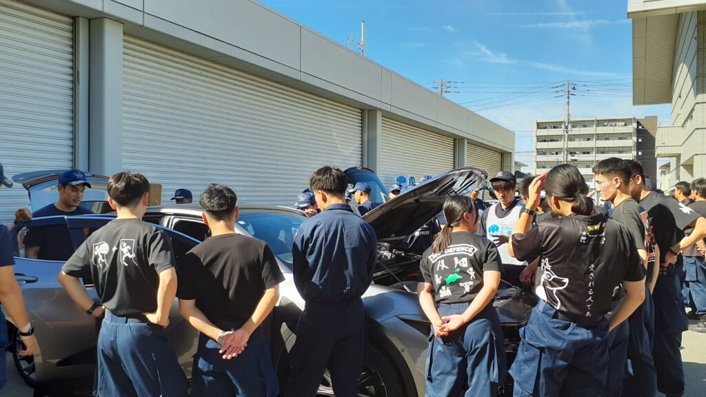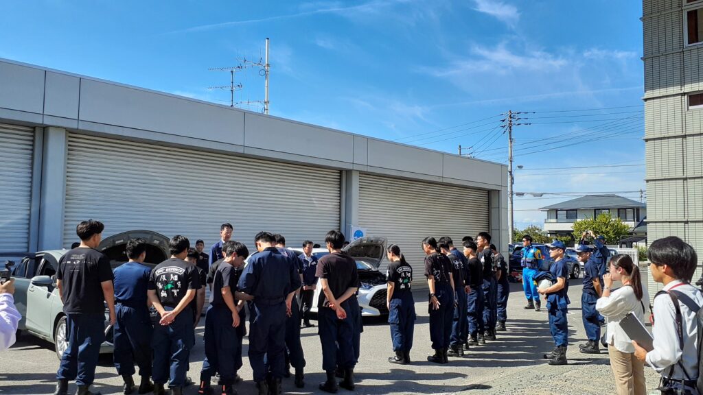 現在、新車販売におけるハイブリッドカーの割合が5割を超え(2023年時点)、災害救助活動時の取り扱いが課題になっています。救助にあたる警察官に感電などの二次災害をおこさず安全に活動してもらうためのセミナーに、笑顔の架け橋プロジェクトはハイブリッドカーを4台用意しました。