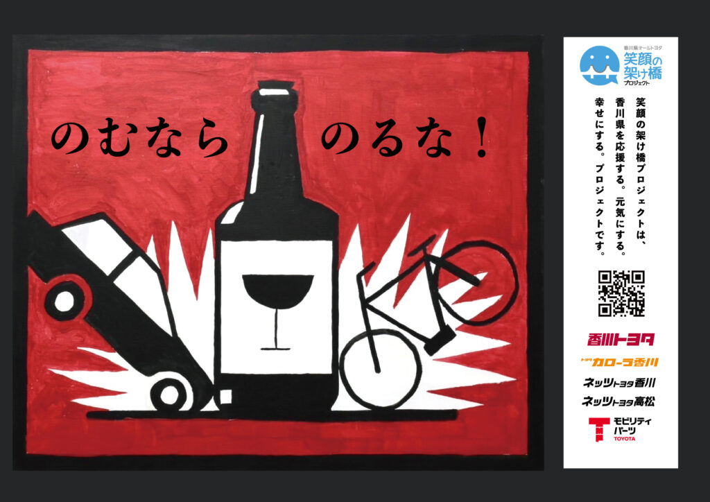 まだまだ悲しいニュースが多いなかで、飲酒運転は絶対ダメだと強く訴えたい。この作品を見た方に分かりやすく強烈に伝えたい思いから、赤、黒、白の三色に絞った色あいにしました。/トヨタモビリティパーツ