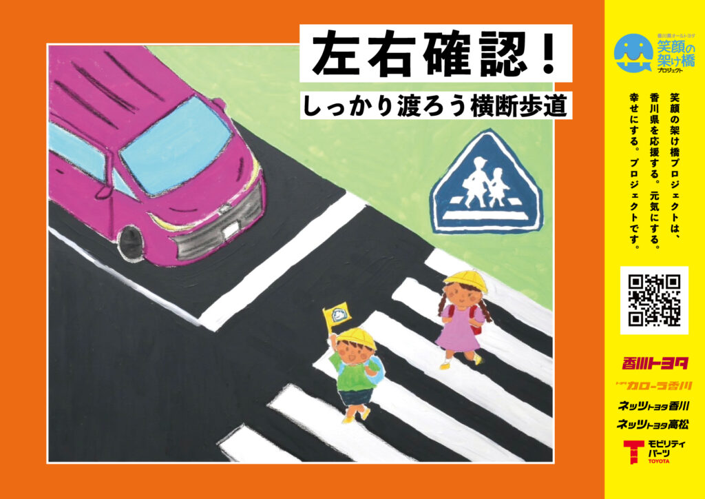 信号のない横断歩道を小学生が渡っている場面。自動車が停止するのは当たり前だけど、渡る側も左右確認を行ない、手や旗をあげて、車側にもしっかり伝える大事さを伝えたいと思いました。/ネッツトヨタ香川