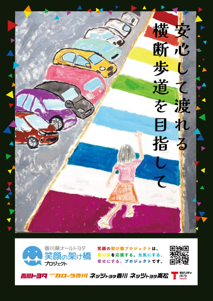 こんなに長い横断歩道はないものの、歩行者のことを考えて作品にしました。信号のない横断歩道での自動車の一時停止が呼び掛けられているなか、歩行者の視点から、“渡りたくても長くて渡れない横断歩道”をイメージしてみました。自動車がたくさん走行していても安心して渡れる横断歩道になればという願いを込めました。/ネッツトヨタ高松