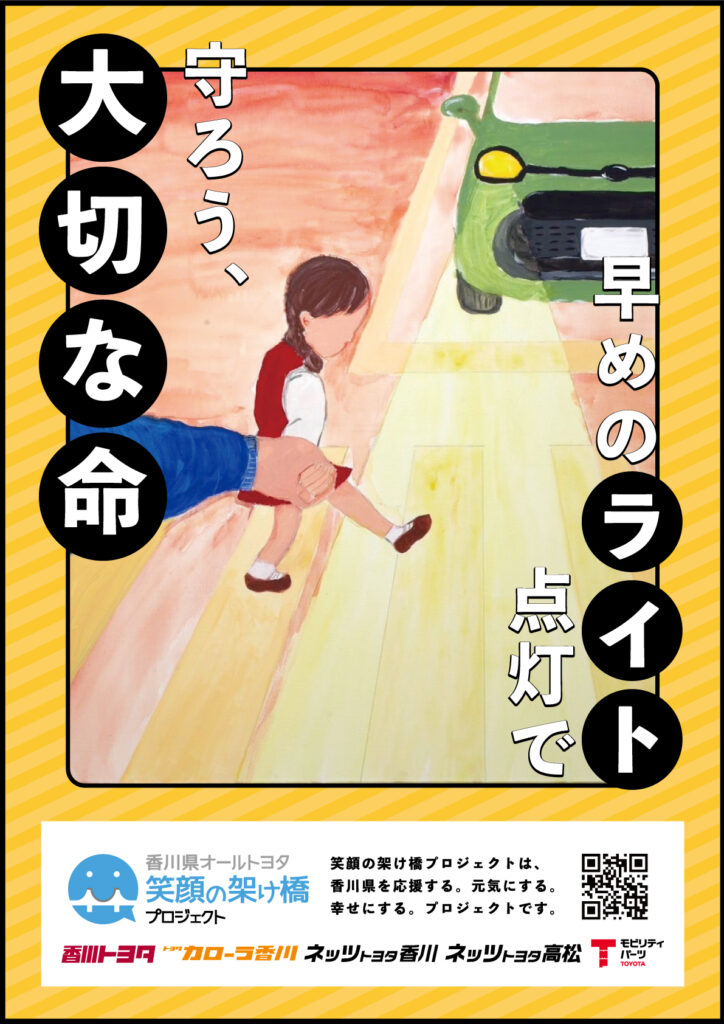交通事故は事故に遭った側も、事故に遭わせた側も悲しい思い、つらい思いをしてしまう。今回の作品は、夕方からの早めのライト点灯、歩行者側も小さい子どもの命を守るために親御さんが手をつないで、飛び出しなど危険を防ぎましょう!という両者側の立場に立って作品にしました。/香川トヨタ